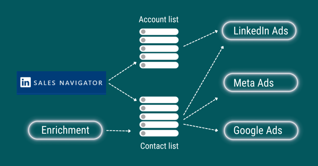 We’ll need LinkedIn Sales Navigator, LinkedIn Ads, Google Ads, Meta Ads, and some third-party services.
